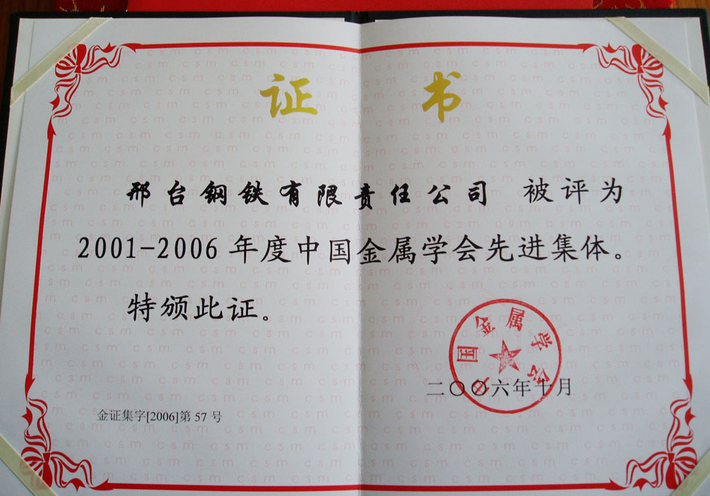 Xingtai Steel was named as Advanced Collective of Chinese Society of Metals.