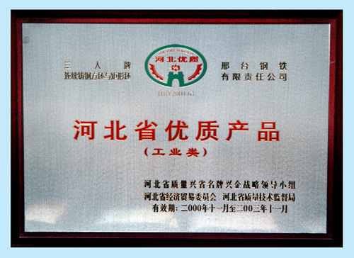 三人牌連續(xù)鑄鋼方坯與矩形坯獲河北省優(yōu)質產品(工業(yè)類)
