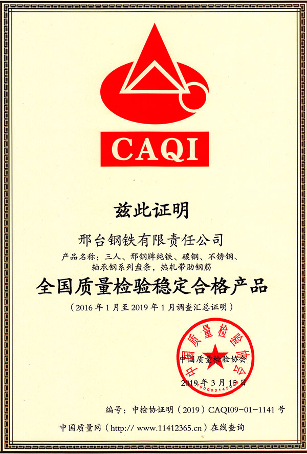 三人、邢鋼牌純鐵、碳鋼、不銹鋼、軸承鋼系列盤條,熱軋帶肋鋼筋產(chǎn)品,被評(píng)為全國質(zhì)量檢驗(yàn)穩(wěn)定合格產(chǎn)品。