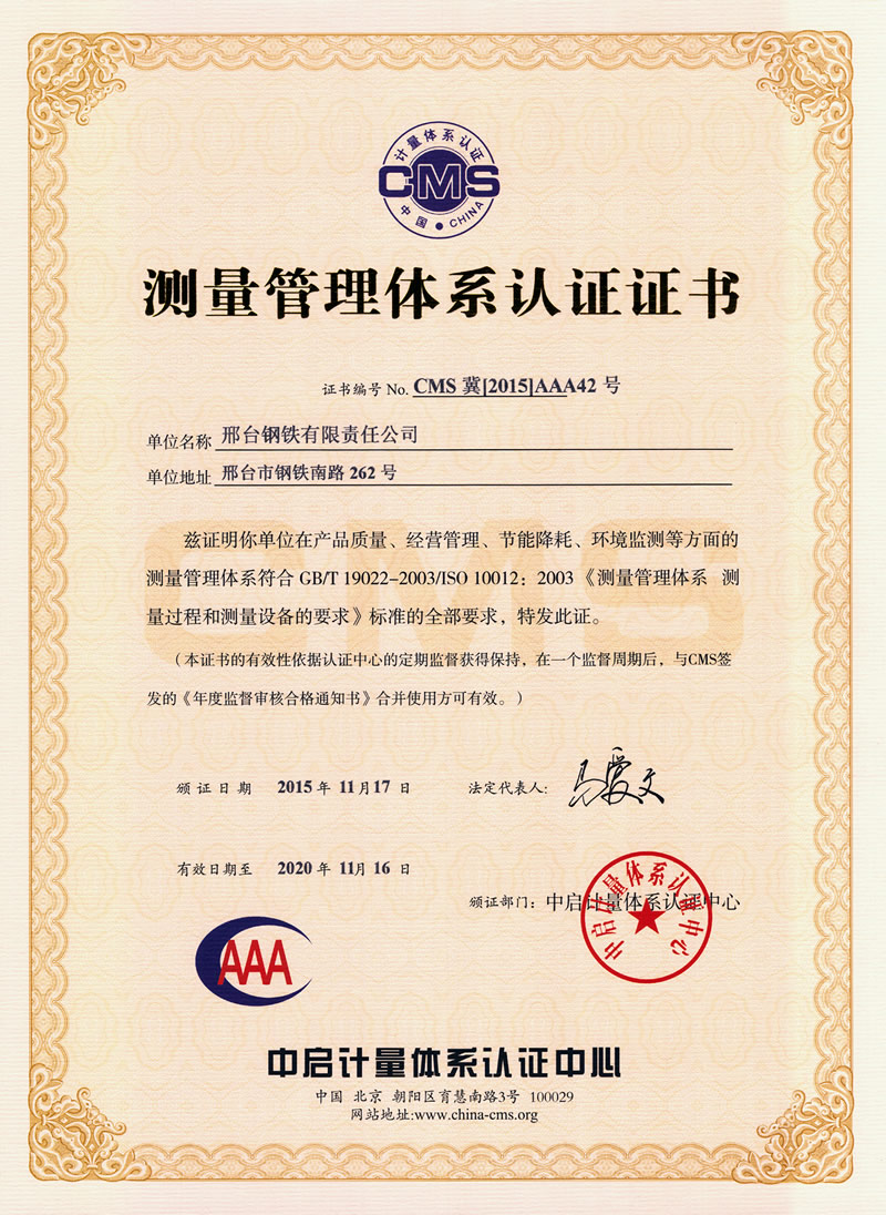 測量管理體系認(rèn)證證書