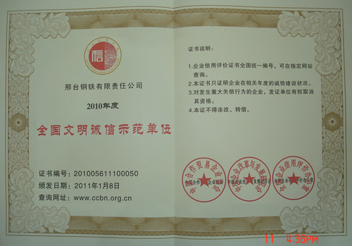 - 邢鋼榮獲2010年“河北省百?gòu)?qiáng)企業(yè)”榮譽(yù)稱號(hào)