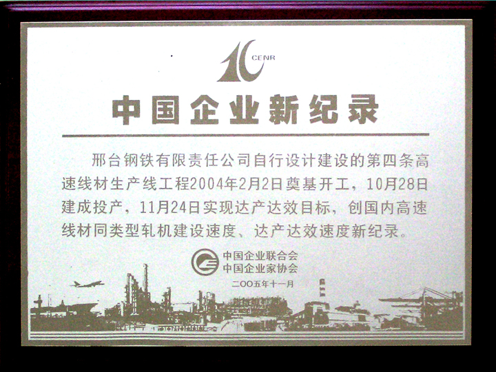 2005年11月,邢鋼自行設(shè)計(jì)建設(shè)的第四條高速線材生產(chǎn)線工程2004年2月2日奠基開工,10月28日建成投產(chǎn),11月24日實(shí)現(xiàn)達(dá)產(chǎn)達(dá)效目標(biāo),創(chuàng)國內(nèi)高速線材同類型軋機(jī)建設(shè)速度、達(dá)產(chǎn)達(dá)效速度新紀(jì)錄。