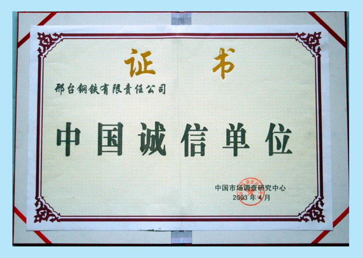 2003年7月,邢鋼獲得中國(guó)行業(yè)企業(yè)信用AAA級(jí)單位評(píng)估證書(shū)。