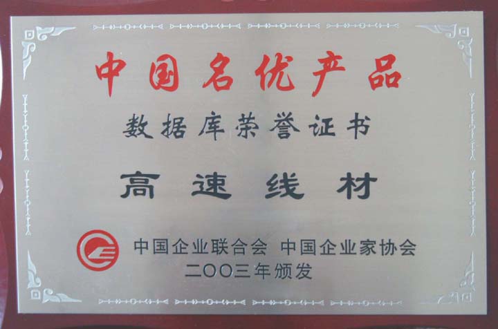 2003年,邢鋼高速線材獲中國(guó)名優(yōu)產(chǎn)品數(shù)據(jù)庫(kù)榮譽(yù)證書(shū)。