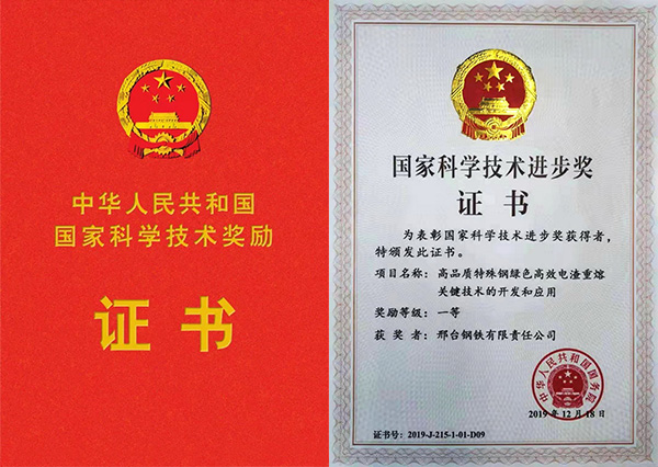 2020年1月10日,2019年度國家科學技術(shù)獎勵大會在人民大會堂隆重舉行。邢鋼作為主要完成單位之一,完成的《高品質(zhì)特殊鋼綠色高效電渣重熔關(guān)鍵技術(shù)的開發(fā)和應用》,喜獲國家科學技術(shù)進步一等獎,系全國鋼鐵行業(yè)十五年來首次獲此殊榮。