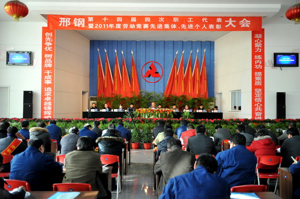 - 1月4日上午八時(shí),公司會(huì)議中心花團(tuán)錦簇,現(xiàn)場(chǎng)氣氛莊重?zé)崃?,在莊嚴(yán)的國(guó)歌聲中,公司第十四屆四次職工代表大會(huì)暨2011年度勞動(dòng)競(jìng)賽先進(jìn)集體、先進(jìn)個(gè)人表彰會(huì)隆重召開。公司領(lǐng)導(dǎo)袁世臻、王春雨、張永藏、苑?,F(xiàn)、梁鋒、戴鶴祥、劉蘭宗、孔俊其、周兵晨、李喜山出席了會(huì)議。邢臺(tái)市總工會(huì)副主席宋起香應(yīng)邀到會(huì)并致詞。