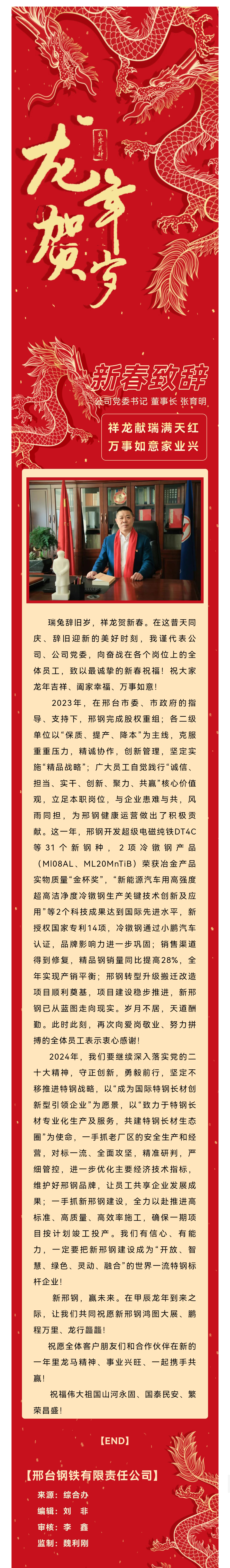 瑞兔辭舊歲,祥龍賀新春。在這普天同慶、辭舊迎新的美好時刻,我謹(jǐn)代表公司、公司黨委,向奮戰(zhàn)在各個崗位上的全體員工,致以最誠摯的新春祝福!祝大家龍年吉祥、闔家幸福、萬事如意!