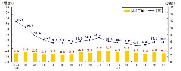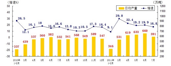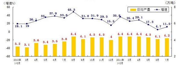 分產(chǎn)品看,7月份,468種產(chǎn)品中有381種產(chǎn)品同比增長。其中,發(fā)電量4252億千瓦時,日平均發(fā)電量137億千瓦時,增長13.2%;鋼材7572萬噸,日平均產(chǎn)量244萬噸,增長14.9%;水泥18308萬噸,日平均產(chǎn)量591萬噸,增長16.8%;原油加工量3749萬噸,日平均產(chǎn)量121萬噸,增長5.9%;十種有色金屬293萬噸,日平均產(chǎn)量9.5萬噸,增長9.8%;乙烯130萬噸,日平均產(chǎn)量4.2萬噸,增長11.5%;汽車131.8萬輛,日平均產(chǎn)量4.3萬輛,下降1.3%;轎車77.7萬輛,日平均產(chǎn)量2.5萬輛,增長12.6%。(參見附圖)