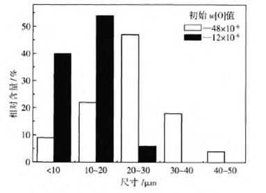 1600℃時(shí),圖1中夾雜物尺寸分別為24μm和11.5μm。鋼中初始氧含量(質(zhì)量分?jǐn)?shù))從48×10-6降低到12×10-6時(shí),粒度為0-10μm和10-20μm夾雜物所占比例成倍增加,粒度為20-30μm夾雜物所占比例降低到5%左右,粒度大于30μm的夾雜物消失。降低鋼水鋁脫氧過(guò)程的初始氧含量可降低脫氧溶質(zhì)元素的過(guò)飽和度,從而增加鋼中小于20μm夾雜物的比例.