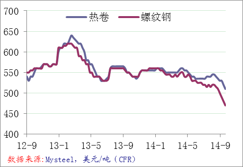 9月份國際市場漲跌互現(xiàn),歐美市場相對較好,亞洲市場下跌明顯。9月份歐洲扁平材價格小幅上漲,主要是需求季節(jié)性恢復(fù)所致,而廢鋼價格下滑則導(dǎo)致長材價格走弱。目前歐洲經(jīng)濟(jì)仍然低迷,9月份需求復(fù)蘇低于預(yù)期,10月份也難有上佳表現(xiàn),隨著廢鋼價格走低,預(yù)計10月份歐洲市場將疲軟運行。9月份美國薄板價格走勢,長材價格小幅上漲。從下游行業(yè)數(shù)據(jù)看,9月份美國經(jīng)濟(jì)增長開始放緩,鋼鐵需求強(qiáng)度也開始下降,這也是薄板價格下滑的根本原因。展望10月份,預(yù)計需求難有太大起色,雖然國內(nèi)鋼廠開始減產(chǎn),但進(jìn)口和庫存壓力依然存在,加上廢鋼價格預(yù)期走弱,預(yù)計10月份美國市場將盤整運行。9月份亞洲市場大幅下滑,主要是中國下跌帶動。目前亞洲主要國家經(jīng)濟(jì)增長均開始放緩,短期內(nèi)恢復(fù)的可能性不大,10月份市場需求仍然疲軟,而鋼廠減產(chǎn)力度也不會太大,但考慮到原料價格已經(jīng)基本觸底,預(yù)計10月份亞洲市場將在底部盤整運行。整體上判斷,10月份國際市場將盤整運行。