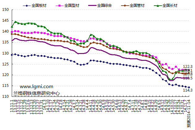 2014年第45周(2014.11.3-11.7)蘭格鋼鐵全國(guó)鋼材綜合價(jià)格指數(shù)達(dá)到118.5點(diǎn),與上周持平,較去年同期下降13.24%。其中,LGMI長(zhǎng)材價(jià)格指數(shù)為122.4點(diǎn),較上周上升0.31%,較去年同期下降15.15%;LGMI型材價(jià)格指數(shù)為122.2點(diǎn),較上周下降0.12%,較去年同期下降12.83%;LGMI板材價(jià)格指數(shù)為114.5點(diǎn),較上周下降0.25%,較去年同期下降11.62%;LGMI管材價(jià)格指數(shù)為120.6點(diǎn),較上周下降0.05%,較去年同期下降13.02%(詳見(jiàn)圖1)。