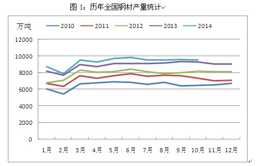 其一,鋼材產(chǎn)量增速有所回落。根據(jù)統(tǒng)計(jì),2014年1-10月,我國(guó)粗鋼產(chǎn)量68535萬噸,同比增長(zhǎng)2.1%,增速同比減緩7.1個(gè)百分點(diǎn);鋼材產(chǎn)量93447萬噸,增長(zhǎng)4.7%,減緩6.9個(gè)百分點(diǎn),國(guó)家政策的導(dǎo)向在這其中起了主要作用。一方面,2014年我國(guó)從政策上嚴(yán)格限制了鋼鐵等產(chǎn)能過剩行業(yè)的投資,由此導(dǎo)致除新疆地區(qū)外,其余省份全年均無高爐新建計(jì)劃,鋼鐵新增產(chǎn)能被控制;另一方面,京津冀地區(qū)持續(xù)霧霾天氣引發(fā)了公眾普遍擔(dān)憂,作為全國(guó)鋼鐵生產(chǎn)基地的河北省不時(shí)由于環(huán)境污染而被強(qiáng)制采取限產(chǎn)措施,雖然對(duì)于環(huán)保排污設(shè)施較為齊全的大型鋼廠影響有限,但中小型鋼廠的生產(chǎn)卻受到了較為明顯的影響,全國(guó)鋼材整體產(chǎn)量增速下滑也就變得順理成章