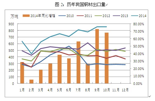 其二,鋼材出口大幅增加。在前兩年鋼材出口增速始終徘徊不前的情況下,2014年我國(guó)鋼材出口量增長(zhǎng)迅速,海關(guān)數(shù)據(jù)顯示,2014年1-10月我國(guó)共出口鋼材7389.3萬噸,同比大幅增長(zhǎng)42.2%,在2014年之前,鋼材出口只占我國(guó)鋼鐵行業(yè)總產(chǎn)量中微不足道的3%,而2014年這一占比卻猛增到10%以上,外需大增極大程度上緩解了國(guó)內(nèi)鋼鐵行業(yè)的供應(yīng)壓力,這也導(dǎo)致在鋼材產(chǎn)量仍在緩慢增長(zhǎng)的情況下我國(guó)鋼鐵行業(yè)供需關(guān)系卻有所緩和。
