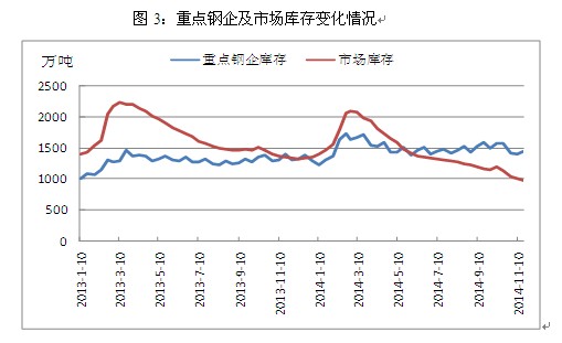 其三,鋼廠經(jīng)營(yíng)風(fēng)險(xiǎn)有所上升。由于近兩年鋼價(jià)持續(xù)大幅下跌,市場(chǎng)上的鋼貿(mào)商苦不堪言,相較于家大業(yè)大且有地方政府扶持的鋼廠,鋼貿(mào)商的日子更加難熬,在持續(xù)虧損以及資金壓力下,超半數(shù)鋼貿(mào)商選擇退出。依然活躍于市場(chǎng)的鋼貿(mào)商在操作上也不復(fù)以往的大開大合,小心謹(jǐn)慎成為了多數(shù)鋼貿(mào)商的選擇,由此帶來的直接后果就是市場(chǎng)庫(kù)存向鋼廠庫(kù)存轉(zhuǎn)移。截止2014年10月末,全國(guó)主要城市鋼材庫(kù)存約為1043萬噸,較2013年同期相比大幅下降25.7%,與之相反的是,此時(shí)重點(diǎn)鋼企庫(kù)存增加到1414.3萬噸,較2013年同期上升9.8%,隨著鋼貿(mào)商 “蓄水池”功能的減弱,鋼廠對(duì)于價(jià)格調(diào)整以及生產(chǎn)策略的變動(dòng)將更為敏感,但與此同時(shí)鋼廠也將承擔(dān)更大的經(jīng)營(yíng)風(fēng)險(xiǎn)。