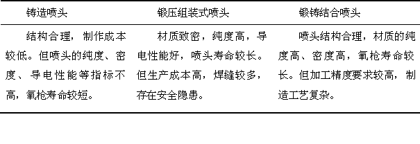因?yàn)槔郀柨仔途哂斜容^高的射流速度,所以氧槍噴頭一般都采用拉瓦爾孔型。為了便于制作擴(kuò)張段,均簡(jiǎn)化為圓錐形。在最近幾年的不斷進(jìn)化中,甚至還出現(xiàn)了“突擴(kuò)”、“旋轉(zhuǎn)”等特殊孔型。按氧槍噴頭的制造方法,氧槍可分為鑄造噴頭、鍛壓組裝式噴頭及鍛鑄結(jié)合噴頭,三種噴頭特點(diǎn)下表所示。