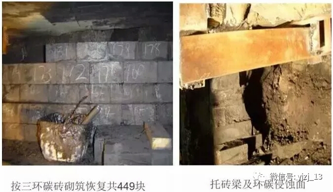 利用工程剩余的UCAR炭磚重新砌筑,部分炭磚需要現(xiàn)場加工外型,縫隙采用炭質(zhì)泥漿??傆嬈鲋?1層,449塊炭磚。