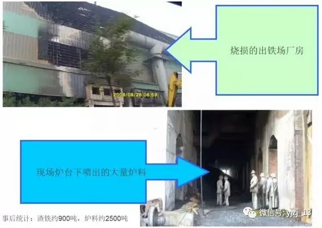 事后確認:4#鐵口下方爐缸燒穿,大量渣鐵和炙熱的爐料(焦炭、礦石)噴出,現(xiàn)場燒損嚴重(新3高爐本體電纜、煤粉噴吹總線電纜、新2高爐電源電纜、計量儀表電纜、出鐵場天棚、4#爐前炮、開口機、東場及北場爐前吊車、爐前休息室、電梯等燒損。)