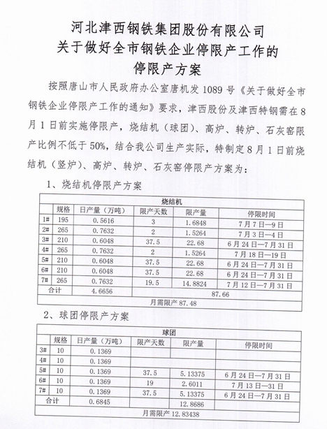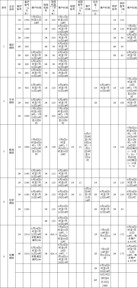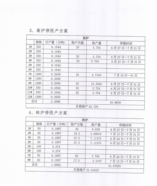 2、132平米燒結(jié)機(jī)、14平米豎爐、轉(zhuǎn)爐和白灰窯限產(chǎn)50%。6月25日0時—7月14日0時停產(chǎn),7月14日0時—7月31日正常生產(chǎn),共停機(jī)19天。