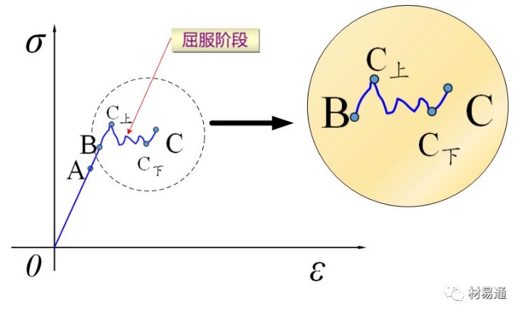OB—彈性階段,BC—屈服階段