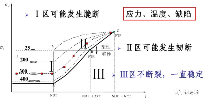 斷裂分析圖通過落錘試驗(yàn)所得NDT可以建立斷裂分析圖Fracture Analysis Diagram,,表示許用應(yīng)力、缺陷(裂紋)和溫度之間的關(guān)系曲線。
