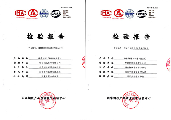 受國家市場監(jiān)督管理總局委托,2019年11月國家鋼鐵產(chǎn)品質(zhì)量監(jiān)督檢驗(yàn)中心對邢鋼高碳鉻軸承鋼進(jìn)行了監(jiān)督抽查,判定依據(jù)為《2019年軸承鋼材產(chǎn)品質(zhì)量國家監(jiān)督專項(xiàng)抽查方案》,現(xiàn)場抽取了2個批次盤條,近日公司收到檢測報(bào)告2個,結(jié)論為:所檢項(xiàng)目符合GB/T18254-2016《高碳鉻軸承鋼》標(biāo)準(zhǔn)及抽樣方案,判定合格,報(bào)告中顯示,7大項(xiàng)29個項(xiàng)目結(jié)果全部高于該產(chǎn)品標(biāo)準(zhǔn),達(dá)到了高級優(yōu)質(zhì)鋼級別水平。