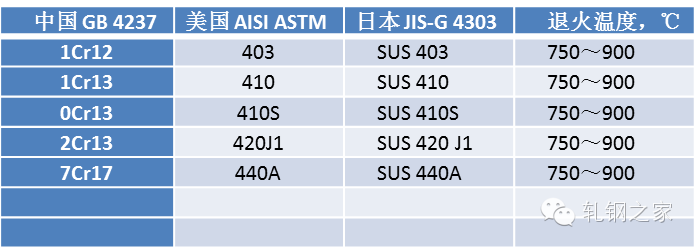 馬氏體鋼是熱裂紋敏感性鋼種,該鋼種在低溫時導(dǎo)熱率低,快速加熱時極易產(chǎn)生裂 紋,因此在處理大斷面材料時,應(yīng)該先預(yù)熱,然后再快速升溫。表 5 為馬氏體不銹鋼的 參考退火溫度。