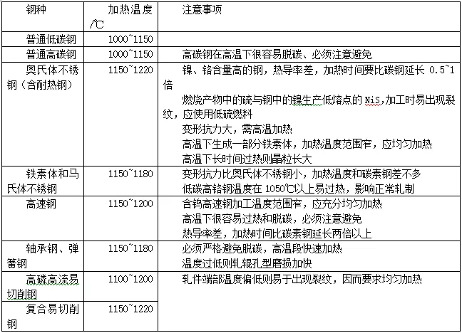 特別注意的是:對于碳鋼加熱溫度一般不能大于1300℃,大于此溫度,其一,鋼坯表面的氧化鐵皮會熔化(純氧化鐵皮的熔點為1377~1565℃,含有雜質時降到1300~1350℃),從鋼表面上掉下來,露出新的表面,燒損迅速增加。其二,當加熱溫度大于1300℃時,鋼坯很有可能會出現(xiàn)過熱或過燒。生產(chǎn)其它鋼種時更應該注意最高加熱溫度。