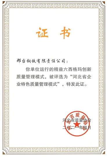 Recently, the list of the first batch of " Characteristic Quality Management Model of Hebei Enterprise " selected by the Hebei Quality Association was announced. Xingtai Iron and Steel Cor., Ltd. (hereinafter referred to as Xingtai Steel), as one of the 10 enterprises received this award, declared the "innovative managerial model on implementing the Lean Six Sigma" which was listed in the first batch of " Characteristic Quality Management Model of Hebei Enterprise" by virtue of its advanced concept, scientific method, easy-to-implement measures and obvious effects. This award highlights its distinctive regional industry characteristics, remarkable leading role and valuable reference.