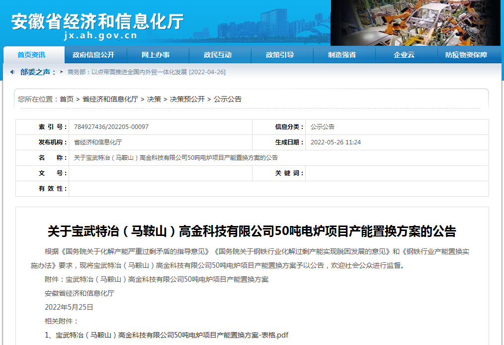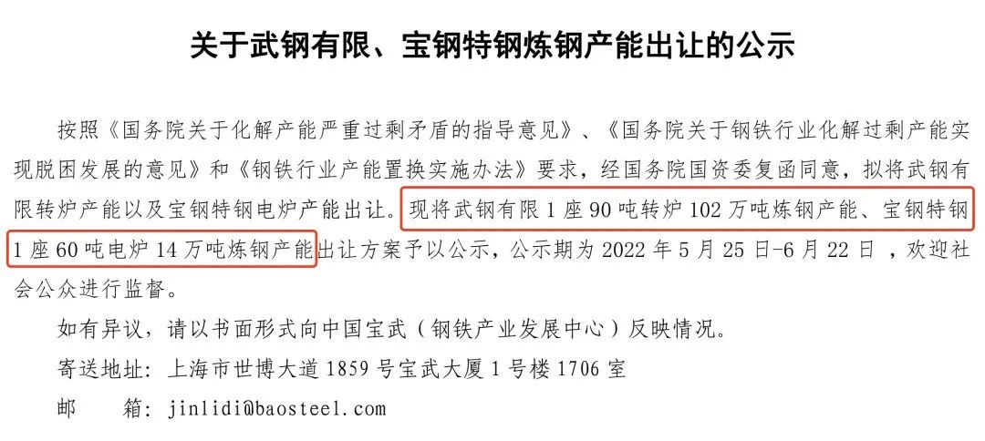 按照《國務(wù)院關(guān)于化解產(chǎn)能嚴(yán)重過剩矛盾的指導(dǎo)意見》、《國務(wù)院關(guān)于鋼鐵行業(yè)化解過剩產(chǎn)能實(shí)現(xiàn)脫困發(fā)展的意見》和《鋼鐵行業(yè)產(chǎn)能置換實(shí)施辦法》要求,經(jīng)國務(wù)院國資委復(fù)函同意,擬將武鋼有限轉(zhuǎn)爐產(chǎn)能以及寶鋼特鋼電爐產(chǎn)能出讓。現(xiàn)將武鋼有限1座90噸轉(zhuǎn)爐102萬噸煉鋼產(chǎn)能、寶鋼特鋼1座60噸電爐14萬噸煉鋼產(chǎn)能出讓方案予以公示,公示期為2022年5月25日-6月22日,歡迎社會(huì)公眾進(jìn)行監(jiān)督。