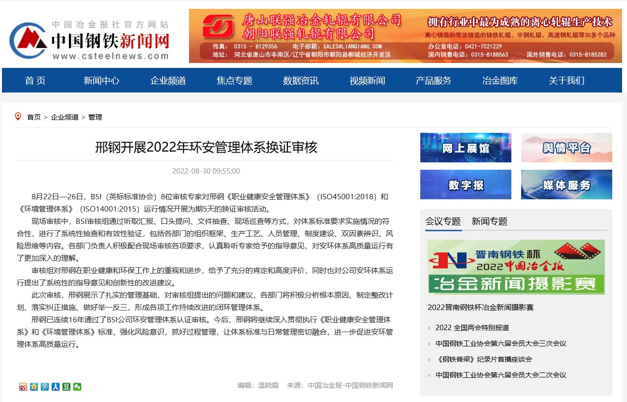 8月22日—26日,BSI(英標(biāo)標(biāo)準(zhǔn)協(xié)會(huì))8位審核專家對(duì)邢鋼《職業(yè)健康安全管理體系》(ISO45001:2018)和《環(huán)境管理體系》(ISO14001:2015)運(yùn)行情況開展為期5天的換證審核活動(dòng)。
