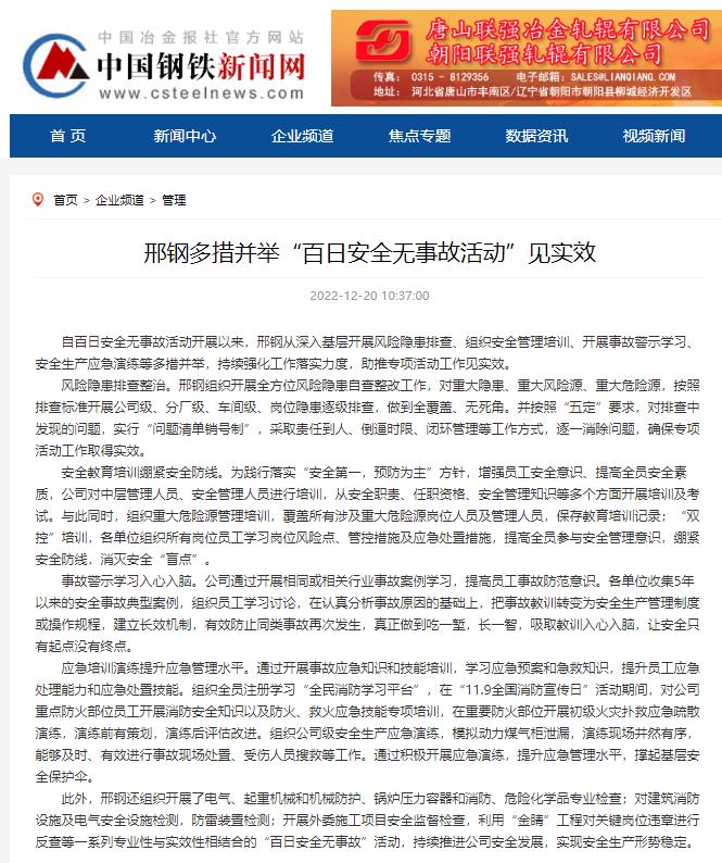 此外,邢鋼還組織開(kāi)展了電氣、起重機(jī)械和機(jī)械防護(hù)、鍋爐壓力容器和消防、危險(xiǎn)化學(xué)品專業(yè)檢查;對(duì)建筑消防設(shè)施及電氣安全設(shè)施檢測(cè),防雷裝置檢測(cè);開(kāi)展外委施工項(xiàng)目安全監(jiān)督檢查,利用“金睛”工程對(duì)關(guān)鍵崗位違章進(jìn)行反查等一系列專業(yè)性與實(shí)效性相結(jié)合的“百日安全無(wú)事故”活動(dòng),持續(xù)推進(jìn)公司安全發(fā)展,實(shí)現(xiàn)安全生產(chǎn)形勢(shì)穩(wěn)定。
