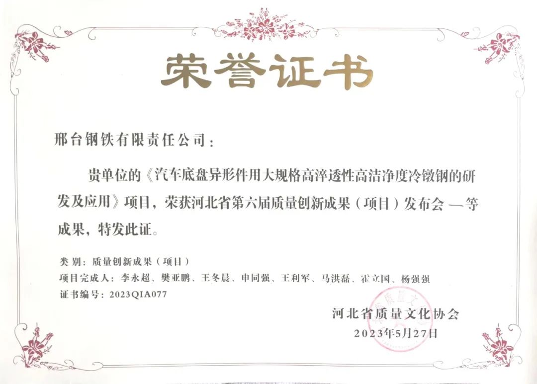 從近日召開的河北省第六屆質(zhì)量創(chuàng)新成果(項(xiàng)目)發(fā)布會上獲悉:邢臺鋼鐵有限責(zé)任公司(以下簡稱邢鋼)再次斬獲多項(xiàng)省級質(zhì)量創(chuàng)新成果殊榮,其中:《汽車底盤異形件用大規(guī)格高淬透性高潔凈度冷鐓鋼的研究及應(yīng)用》、《提高超低碳鋼成品碳含量≤50ppm比例》、《優(yōu)質(zhì)碳素鋼拉拔斷裂問題的改善與研究》榮獲示范級質(zhì)量創(chuàng)新成果;《提高6#高爐生鐵產(chǎn)量》和《全流程能效監(jiān)管系統(tǒng)的搭建與應(yīng)用》榮獲專業(yè)級質(zhì)量創(chuàng)新成果;《降低成品線材擦劃傷率》榮獲改進(jìn)級質(zhì)量創(chuàng)新成果。