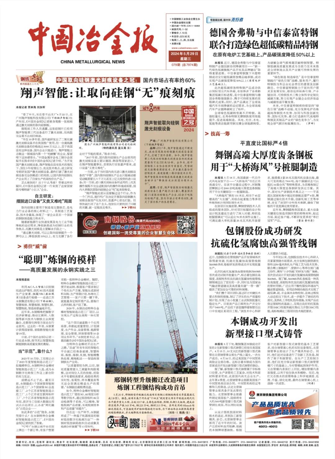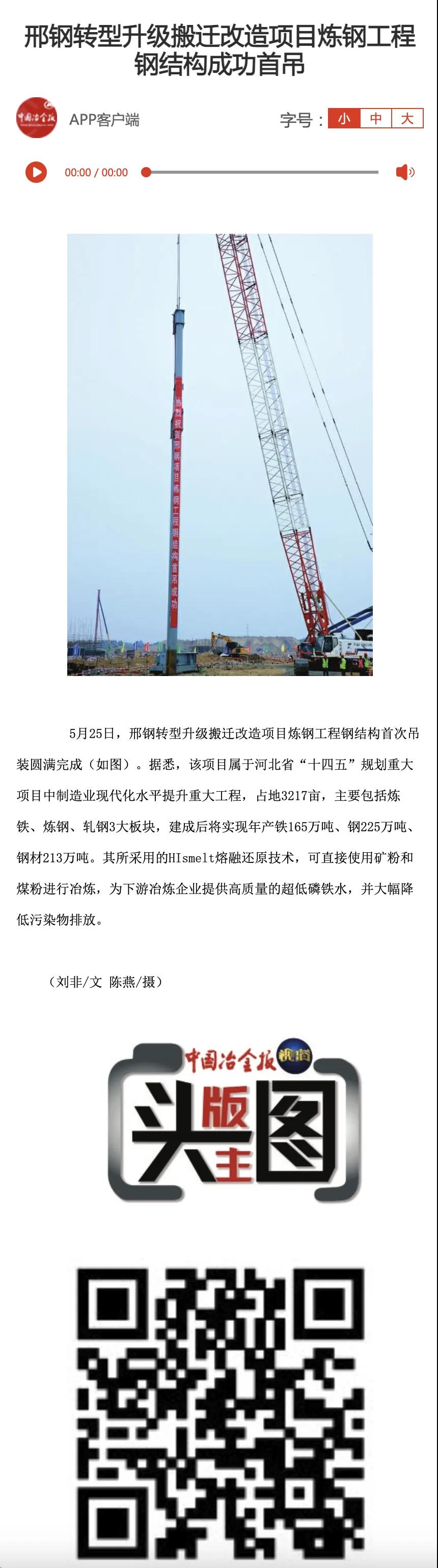 【媒體報道】中國冶金報“頭版主圖”報道邢鋼轉型升級項目進展