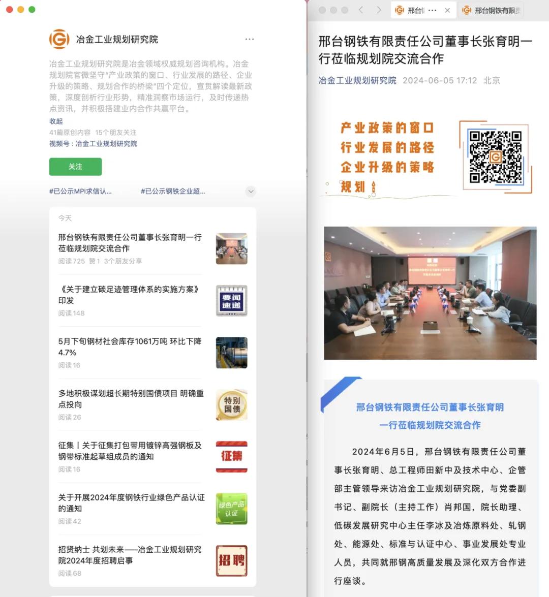 2024年6月5日,邢臺(tái)鋼鐵有限責(zé)任公司黨委書記、董事長張育明在總工程師兼董事長、總經(jīng)理助理田新中及技術(shù)中心、企管部相關(guān)負(fù)責(zé)人的陪同下,到訪冶金工業(yè)規(guī)劃研究院,與黨委副書記、副院長(主持工作)肖邦國,院長助理、低碳發(fā)展研究中心主任李冰及冶煉原料處、軋鋼處、能源處、標(biāo)準(zhǔn)與認(rèn)證中心、事業(yè)發(fā)展處專業(yè)人員,共同就邢鋼高質(zhì)量發(fā)展及深化雙方合作進(jìn)行座談。