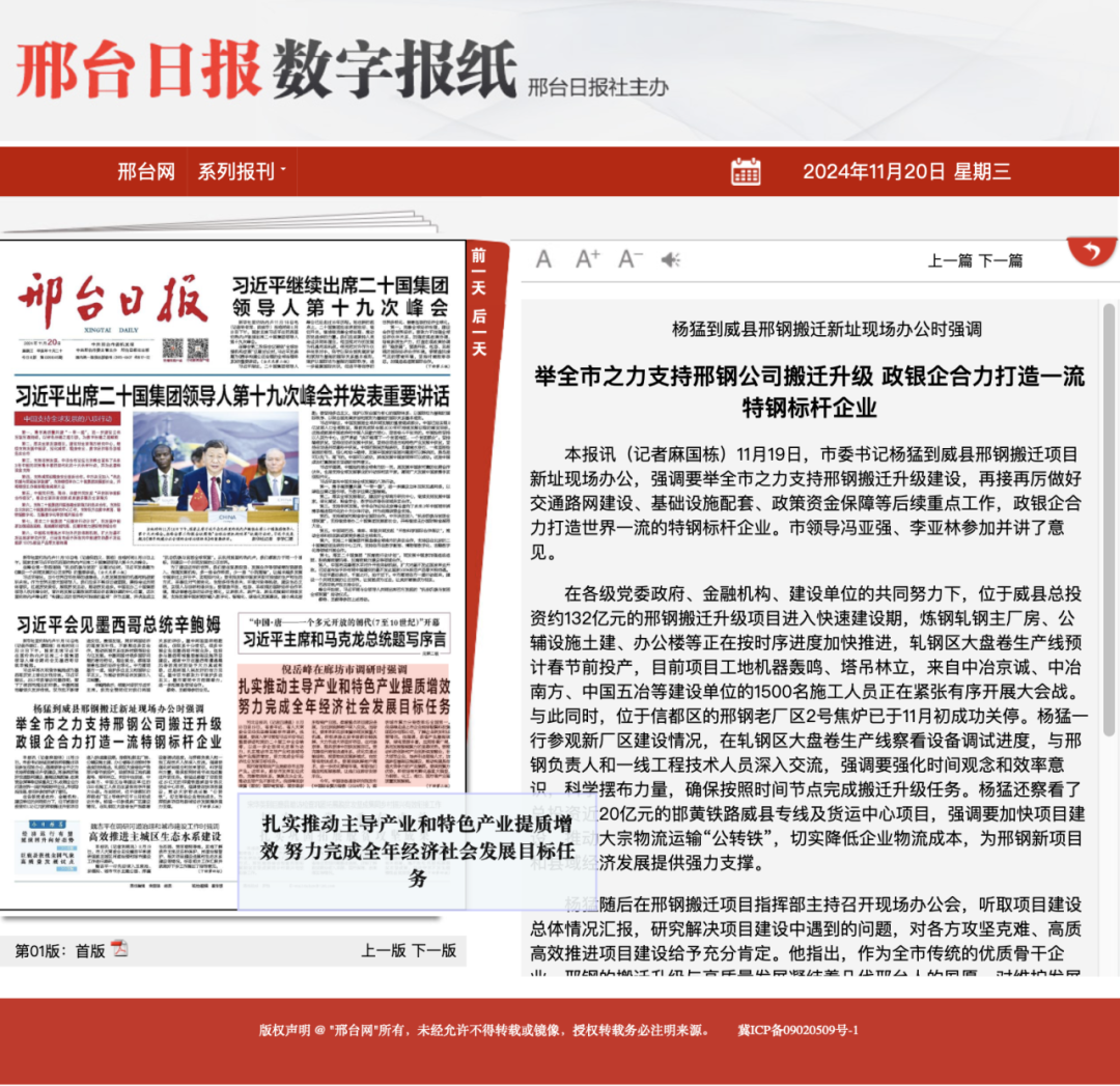 楊猛隨后在邢鋼搬遷項目指揮部主持召開現(xiàn)場辦公會,聽取項目建設(shè)總體情況匯報,研究解決項目建設(shè)中遇到的問題,對各方攻堅克難、高質(zhì)高效推進項目建設(shè)給予充分肯定。他指出,作為全市傳統(tǒng)的優(yōu)質(zhì)骨干企業(yè),邢鋼的搬遷升級與高質(zhì)量發(fā)展凝結(jié)著幾代邢臺人的夙愿,對維護發(fā)展穩(wěn)定大局、實現(xiàn)全市跨越趕超意義重大,全市上下要搶抓“百泉復(fù)涌”歷史新機遇,增強務(wù)實擔(dān)當(dāng)?shù)呢?zé)任感和分秒必爭的緊迫感,搶抓黃金施工期,舉全市之力破解關(guān)鍵難題、強化要素保障,全力推動邢鋼新廠區(qū)盡快建成投產(chǎn)、老廠區(qū)按時關(guān)停。威縣要提高站位、統(tǒng)一思想,一鼓作氣推進服務(wù)保障工作,積極組織銀企對接、產(chǎn)業(yè)招商、產(chǎn)品推介等活動,引導(dǎo)形成全社會支持邢鋼發(fā)展的良好氛圍,切實放大邢鋼新廠輻射帶動效應(yīng),努力打造獨具特色的特鋼產(chǎn)業(yè)集群。各金融機構(gòu)要形成工作合力,創(chuàng)新金融產(chǎn)品,主動加強與企業(yè)對接服務(wù),積極爭取上級金融機構(gòu)支持,為項目建設(shè)提供堅實保障。市直相關(guān)部門要積極對接項目建設(shè),提前介入、靠前服務(wù),吃透用好各項有利政策,拿出幫助搬遷建設(shè)的硬政策硬舉措,形成推動后續(xù)發(fā)展的政策合力,把邢鋼打造成為我市新材料產(chǎn)業(yè)的強力支撐。