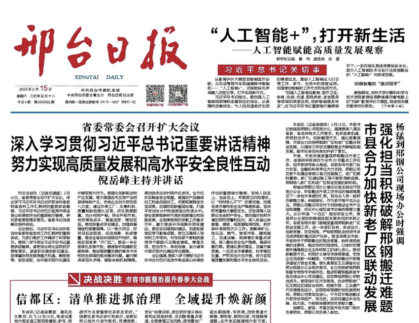 2月14日,市委書記楊猛到邢鋼公司現(xiàn)場辦公,強調要深入落實省委、省政府相關工作要求,搶抓政策機遇、積極擔當作為,創(chuàng)新融資方式、強化要素保障,市縣合力加快邢鋼新廠區(qū)和老廠區(qū)搬遷聯(lián)動發(fā)展,以強有力項目支撐助推全市跨越趕超發(fā)展。副市長李亞林參加并講了意見。