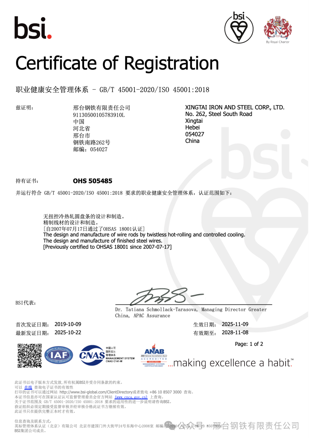 近日,邢臺鋼鐵有限責任公司(簡稱“邢鋼”)順利通過英國標準協(xié)會(BSI)對其職業(yè)健康安全管理體系與環(huán)境管理體系的再認證審核,取得新版證書。該公司自2007年首次通過該體系認證以來,已連續(xù)十八年保持體系持續(xù)有效運行,體現(xiàn)出在安全與環(huán)境管理方面長期穩(wěn)定的合規(guī)能力和管理韌性。