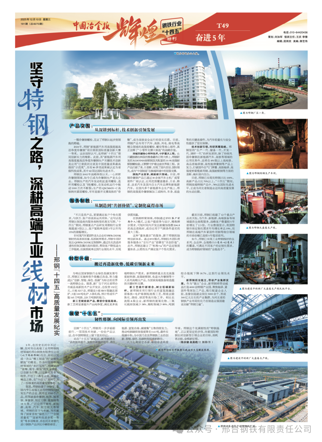 5年,在歷史長河中不過一瞬,但對專注高端工業(yè)用特鋼線材領(lǐng)域的邢臺鋼鐵有限責(zé)任公司(以下簡稱邢鋼)而言,卻足以完成一次從“精工制造”到“定制化賦能”的蝶變。作為中國特鋼線材領(lǐng)域的“單打冠軍”,邢鋼堅持“做精、做專、做強(qiáng)”的發(fā)展戰(zhàn)略,以創(chuàng)新為引擎,以定制化服務(wù)為紐帶,開創(chuàng)了一條專業(yè)化、高端化精品之路,在“十四五”期間交出了一份厚重的高質(zhì)量發(fā)展答卷。
